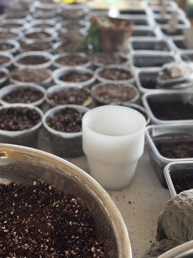 Well, after potting and setting up the work station, I am pleased to look out over the field and see 10 thousand seedlings springing up with tall mighty healthy leaves.