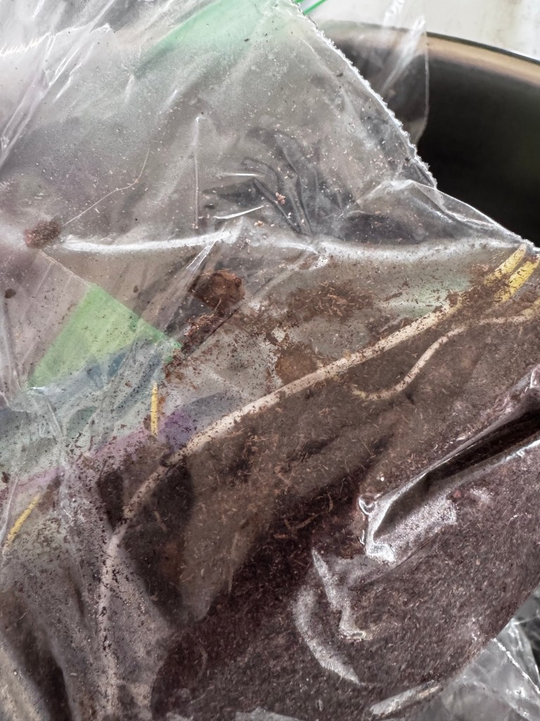 PEAT, COMPOST, BIOCHAR, HYPHAE, — I decided to grab a gallon of fresh rain water for the storm last evening believing that the energy will somehow create the vigor I needed for growing my seed to life,— wherever it was… Painfully I added a 1/4 gram of stuff-fluff to 1/4 cup mixture of medium and with a one ml. dropper full of enriched freshly collected water, I was as prepared as I would ever be. — Today 101 baggies in a warm and dark space…. Mimicking the world of what it would be if that little seed fell to the grounds naturally. Into the crock they went, and then into the dark warm closet the crock was stored away. Dark & Warm my incubator of freshly fertilized ovum, swelling and growing. Or so I hope.