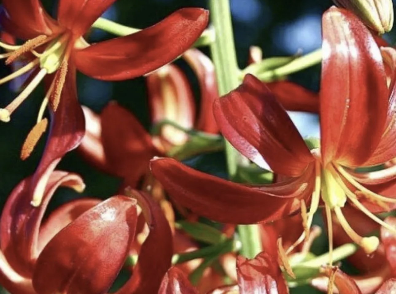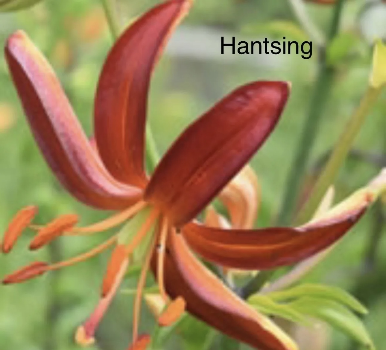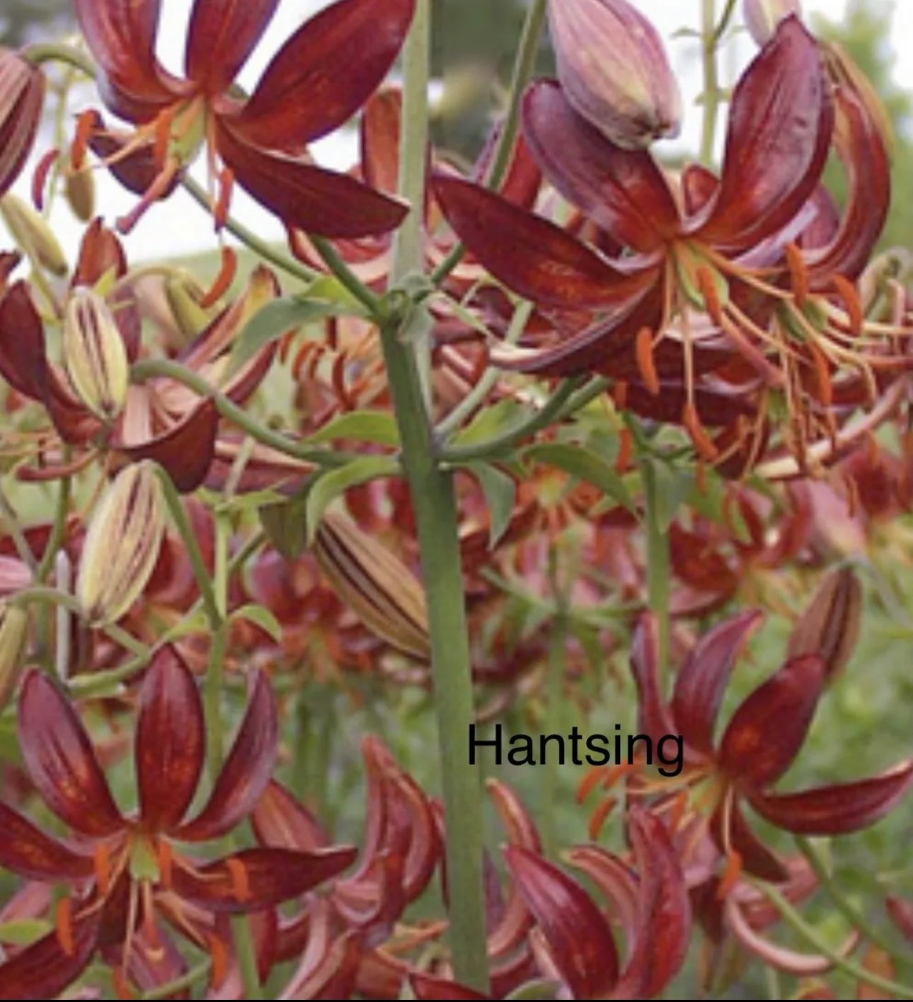 Inside bright, light red, centre pale yellow; outside pale creamy; spots almost absent . Stems 1.2-1.5 m, with c.20 fls. July. (Unacceptable name: ‘Hantsing’ (being formed from dalhansonii and tsingtauense) is not acceptable under ICNCP, 2004: Art. 19.13 – after 1959 a name must be in any language other than Latin.). There is unusual lineage that needs to be pointed out with this hybrid and that is that it is a sibling of L. martagon ‘Orange Marmalade’. when studying closely, one see such similarities that I now am wondering what would happen if the two were crossed—- this has now happened and we will await