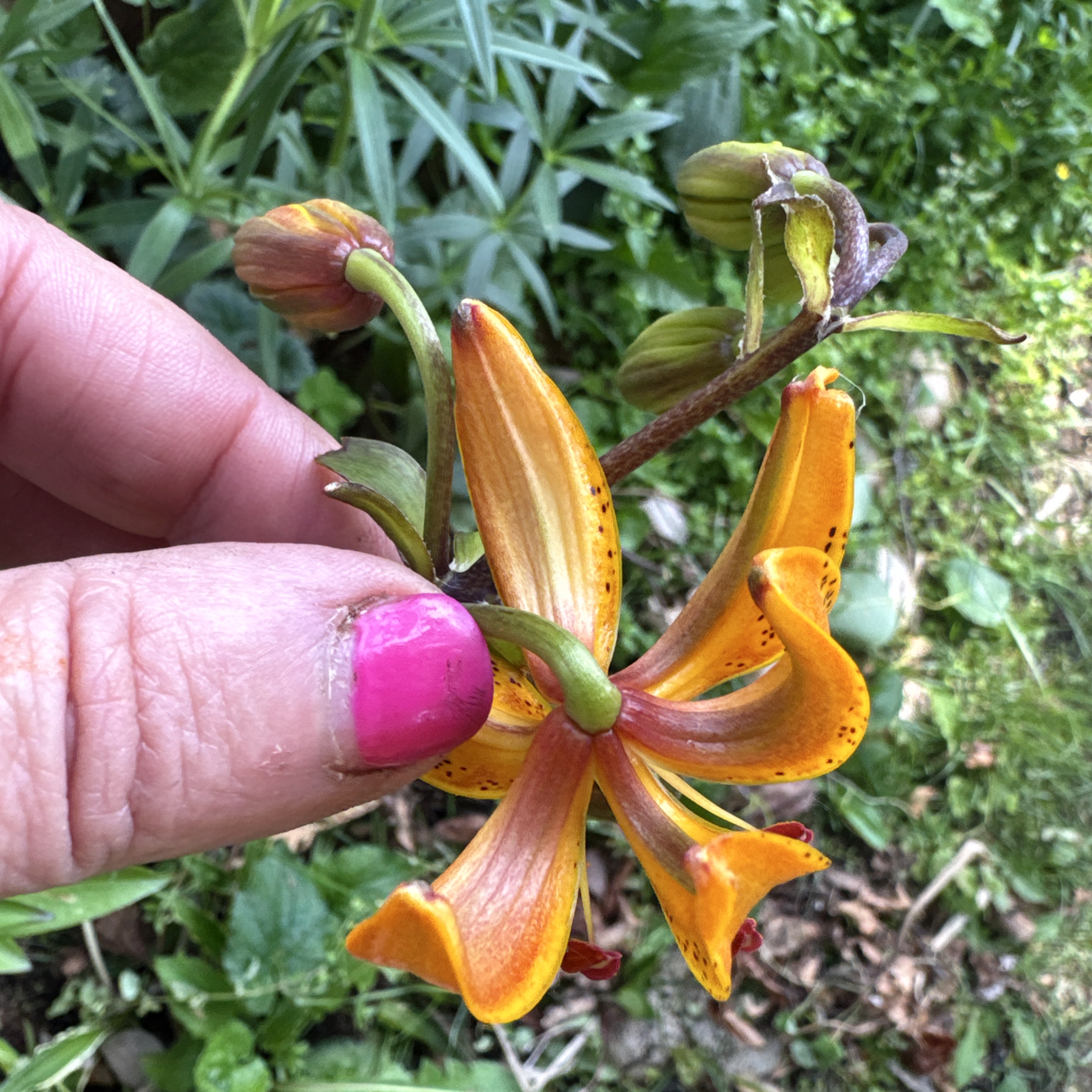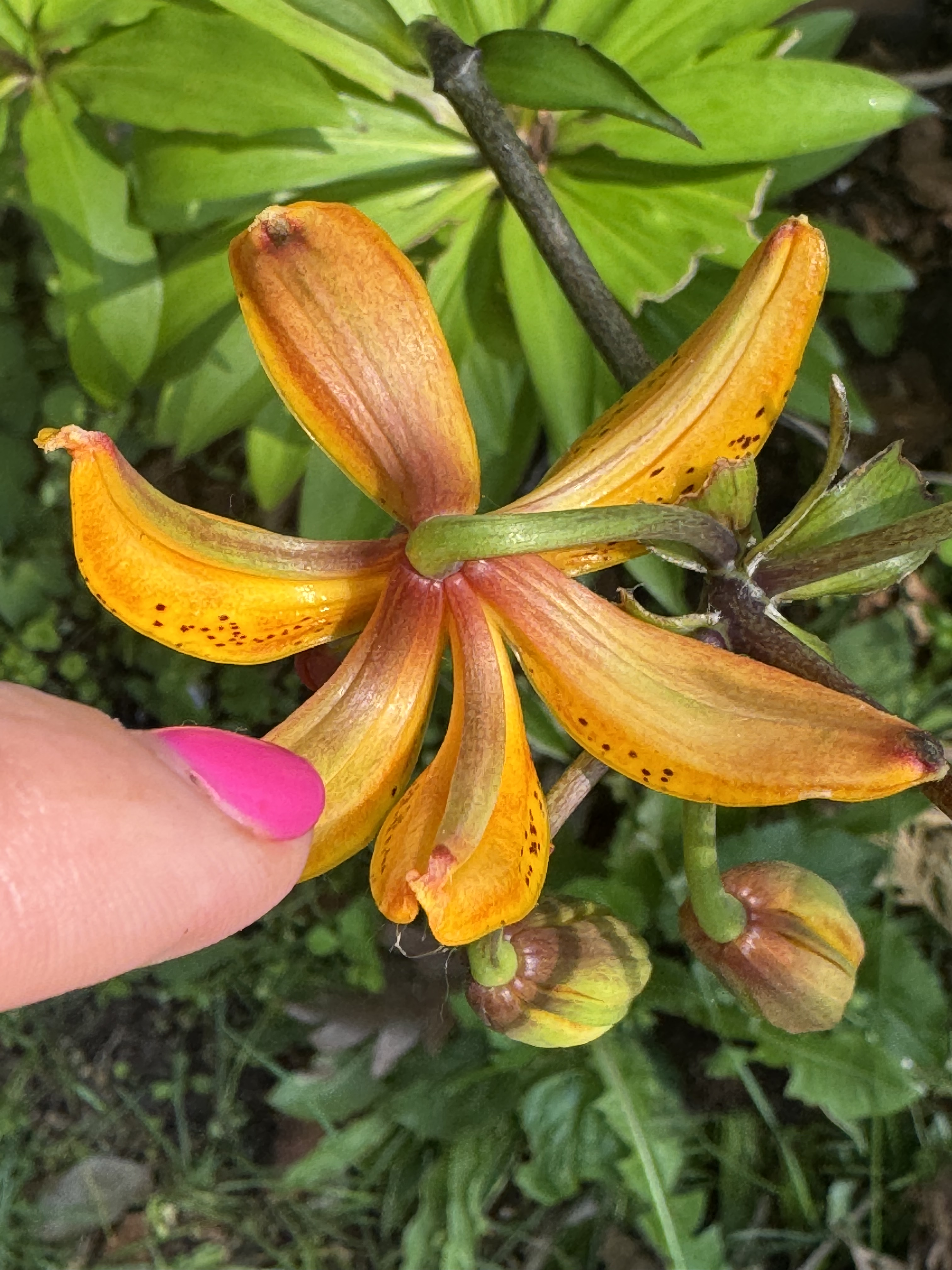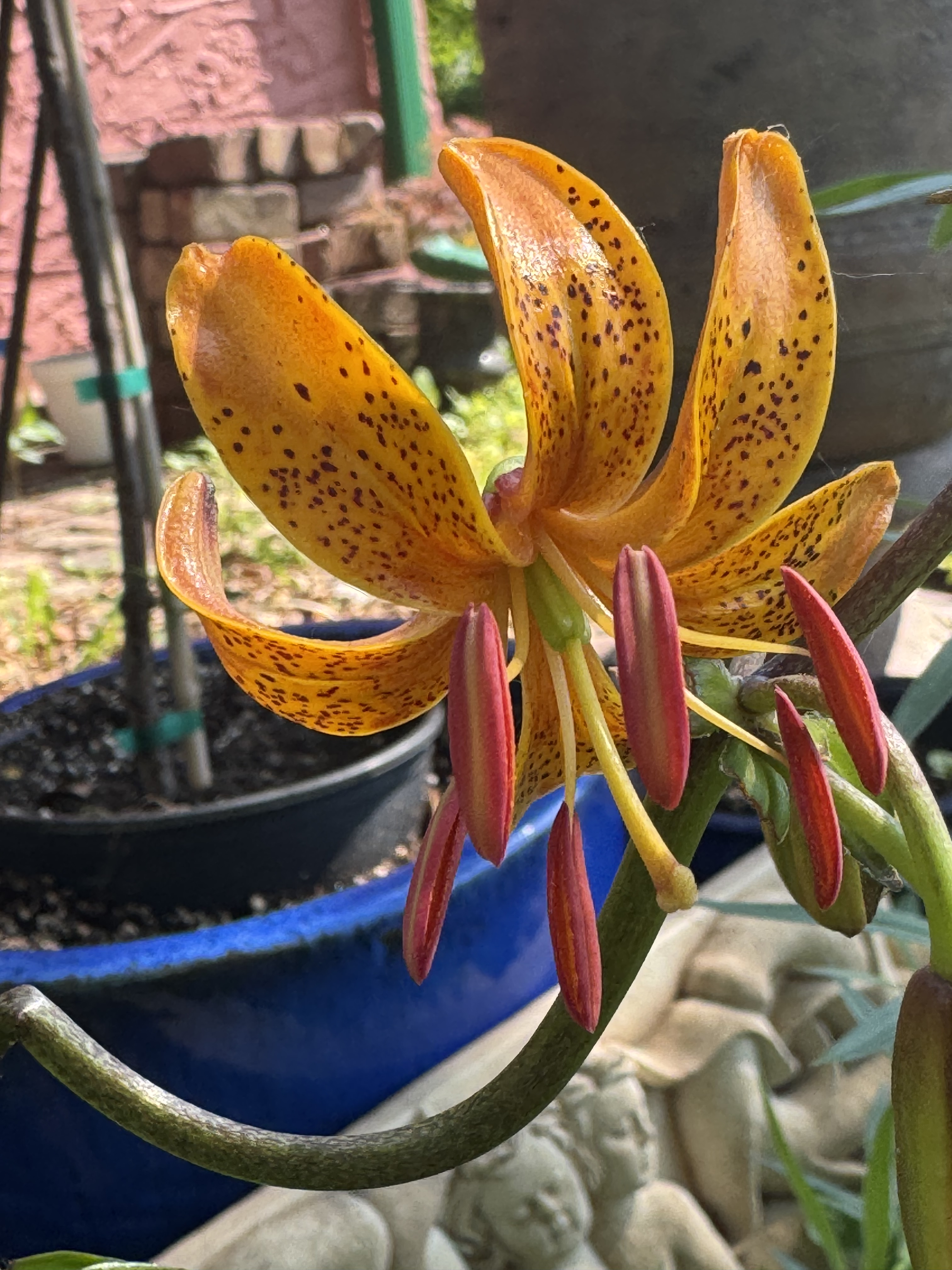 Here is the first martagon to bloom in 2025 — It was labeled as Guinea Gold— Not. I will plan to observe this seedling and see if anyone post a similar bloomed martagon like this bright blazing saturated butterscotch with a chocolate stem. Truly this glows and I am sure there is a name already attached, I just have not uncovered its identity as of yet.