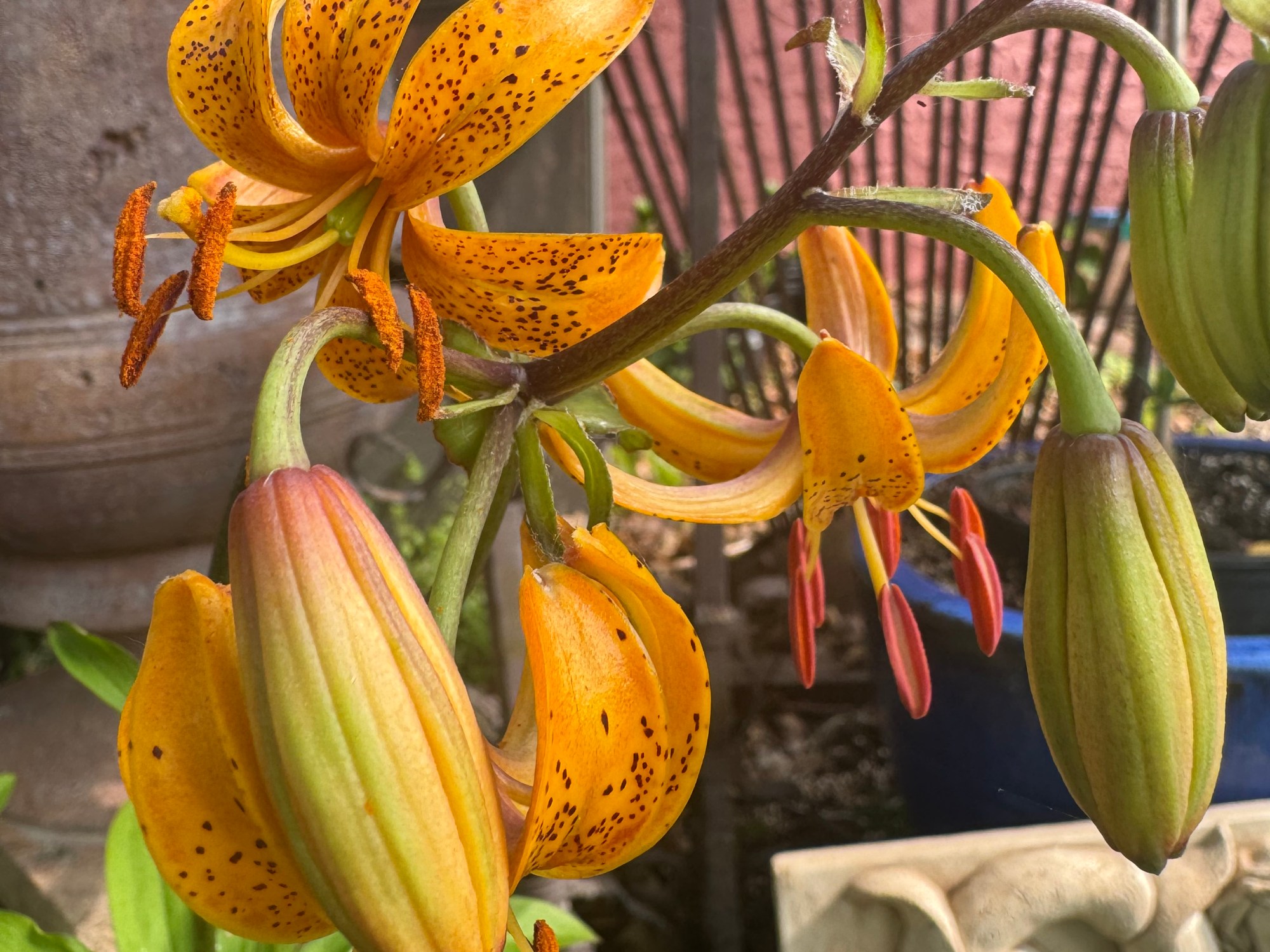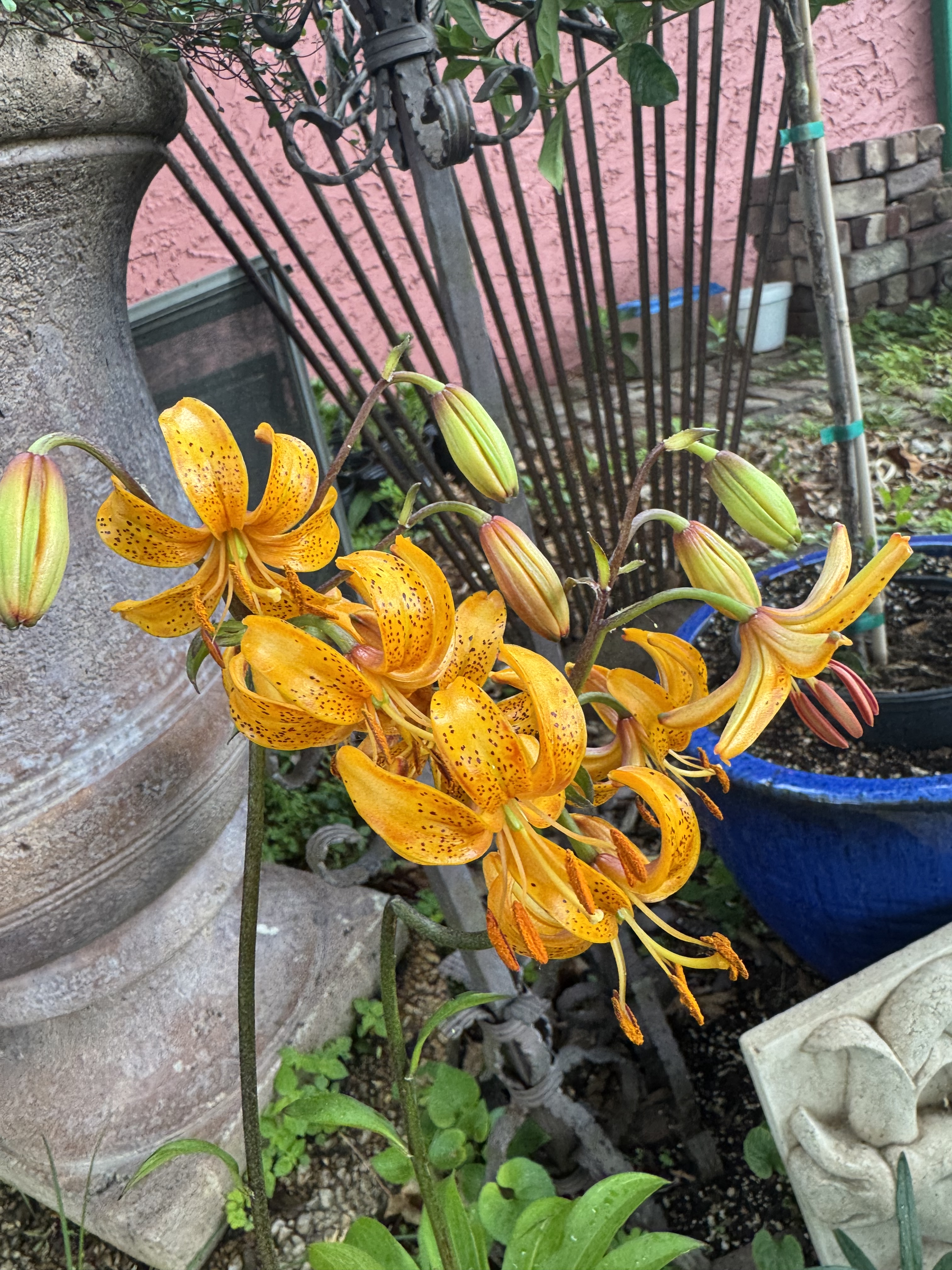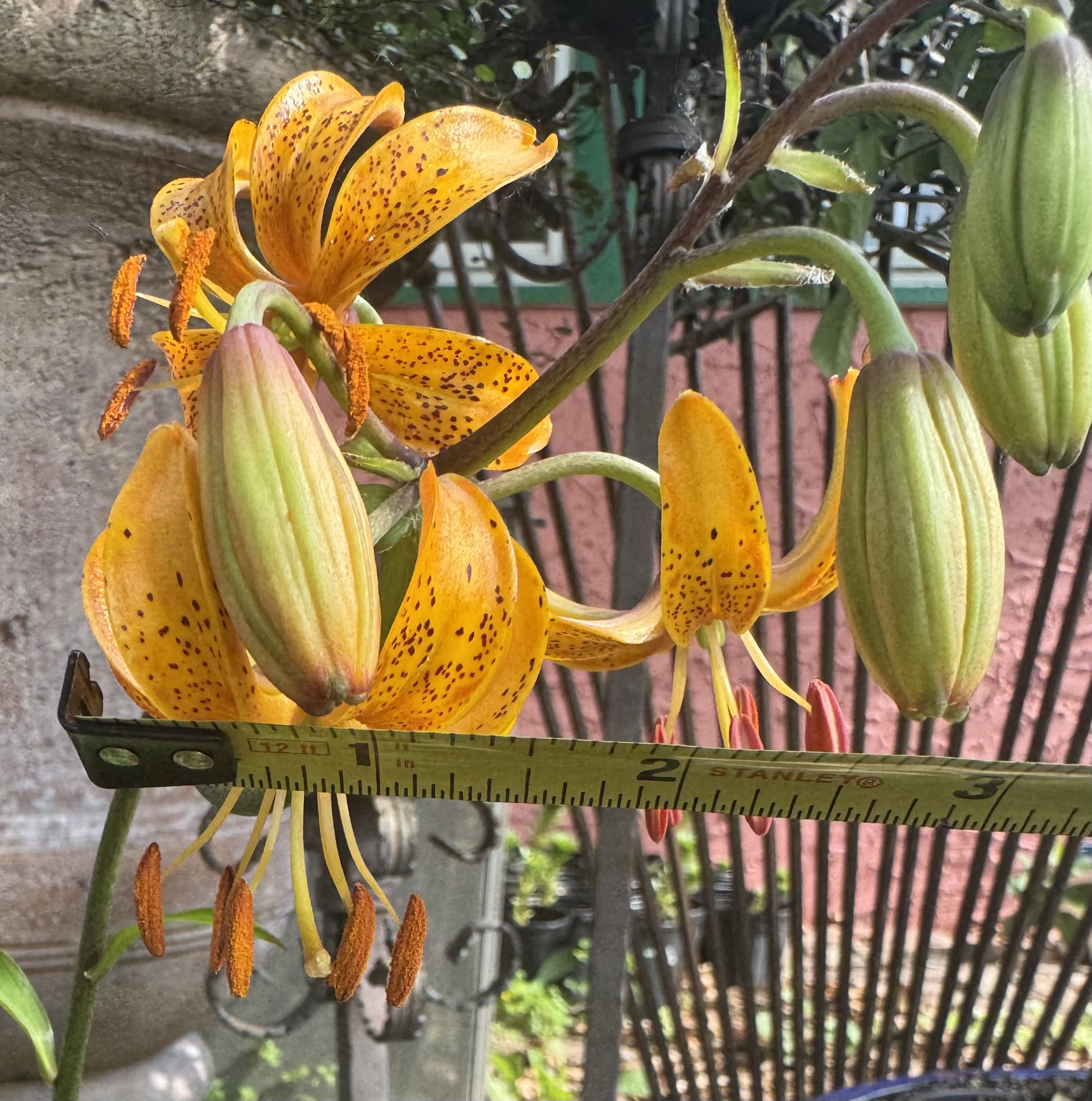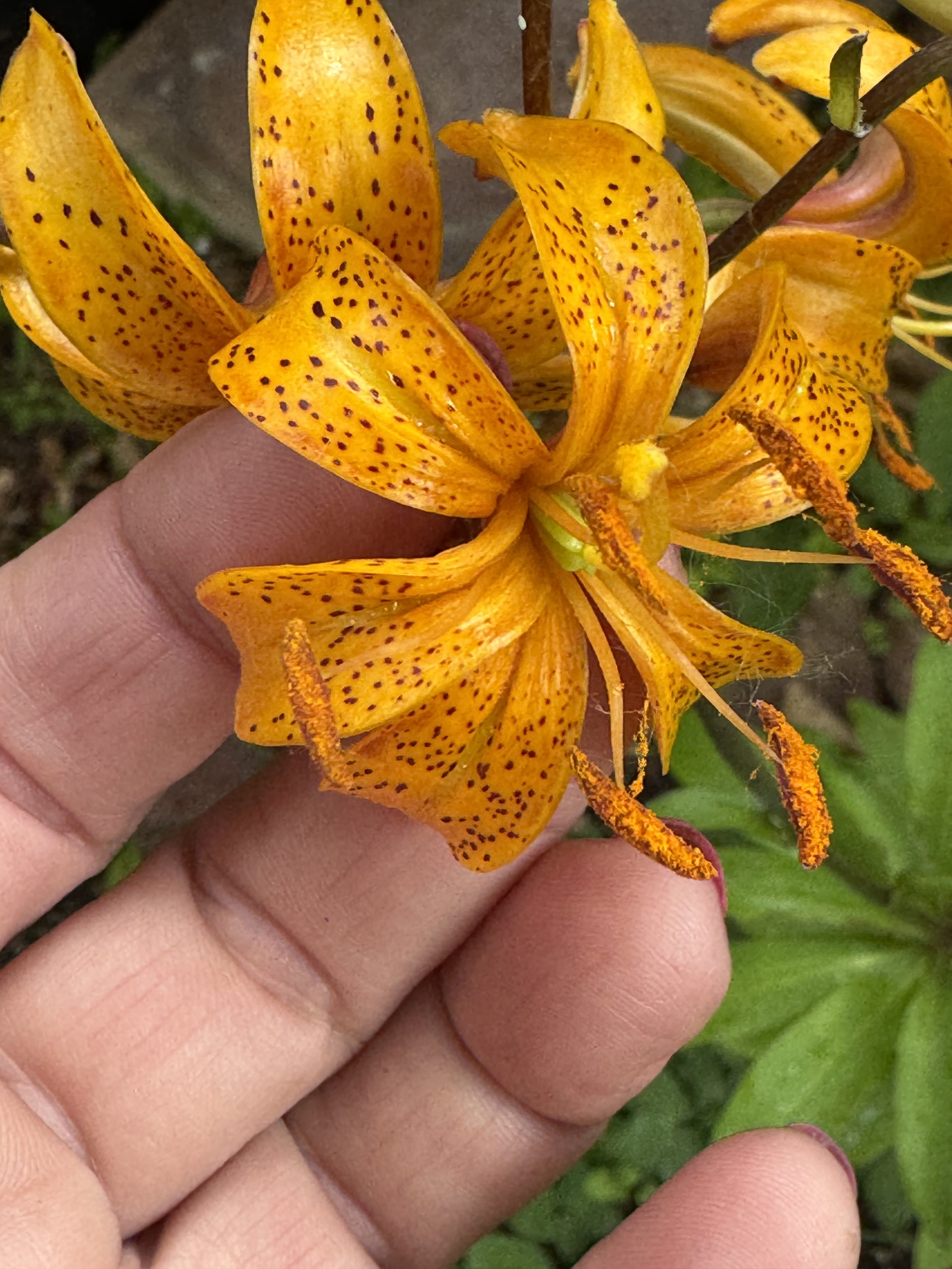 Here is the first martagon to bloom in 2025 — It was labeled as Guinea Gold— Not. I will plan to observe this seedling and see if anyone post a similar bloomed martagon like this bright blazing saturated butterscotch with a chocolate stem. Truly this glows and I am sure there is a name already attached, I just have not uncovered its identity as of yet.