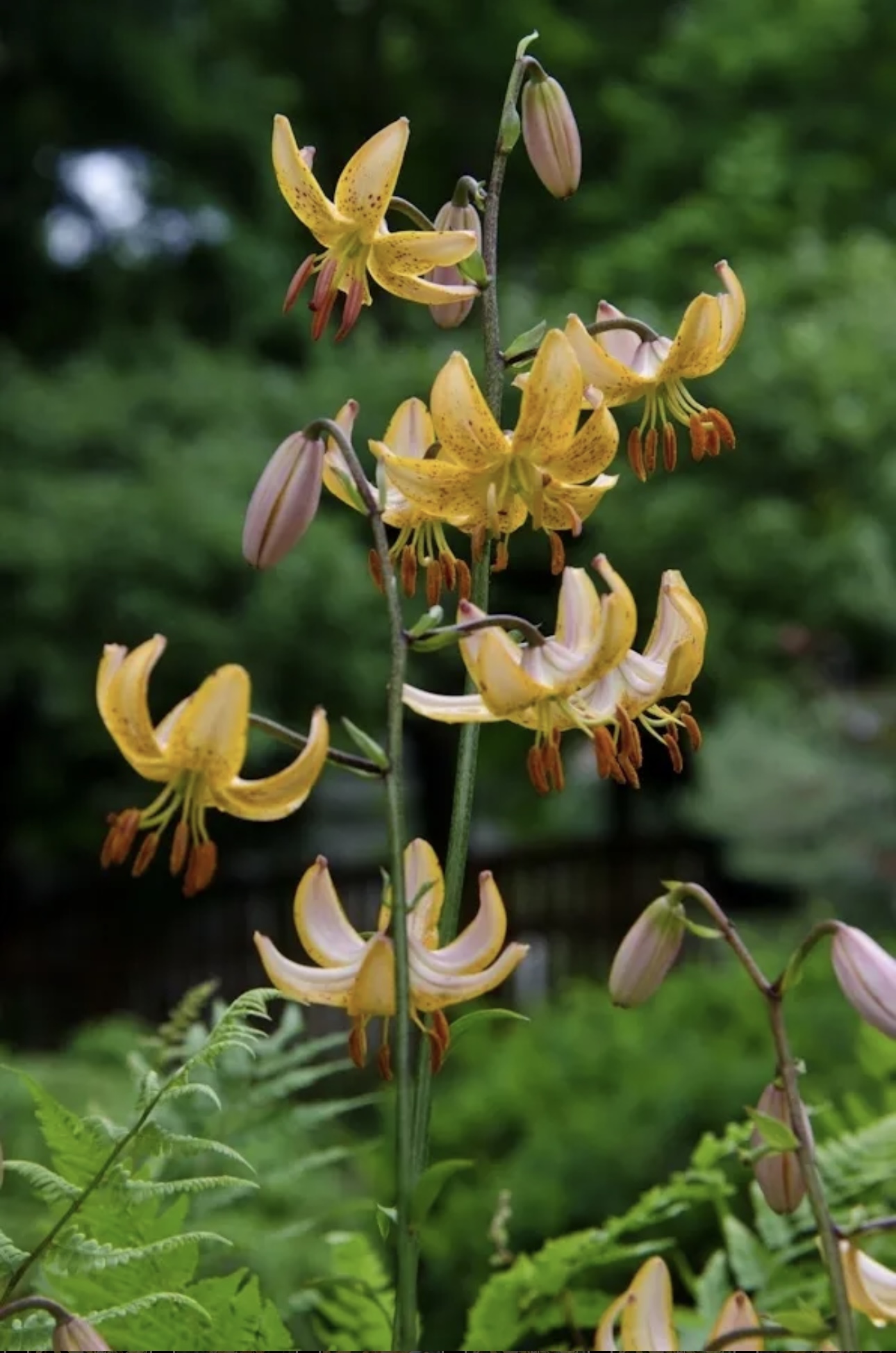 Inside orange-yellow; outside slightly flushed with magenta-pink; spots purple, sparse. Lvs whorled. Stems 1.5-1.9 m. June. (Published in Gard. Chron., ser. 3, 69: 313