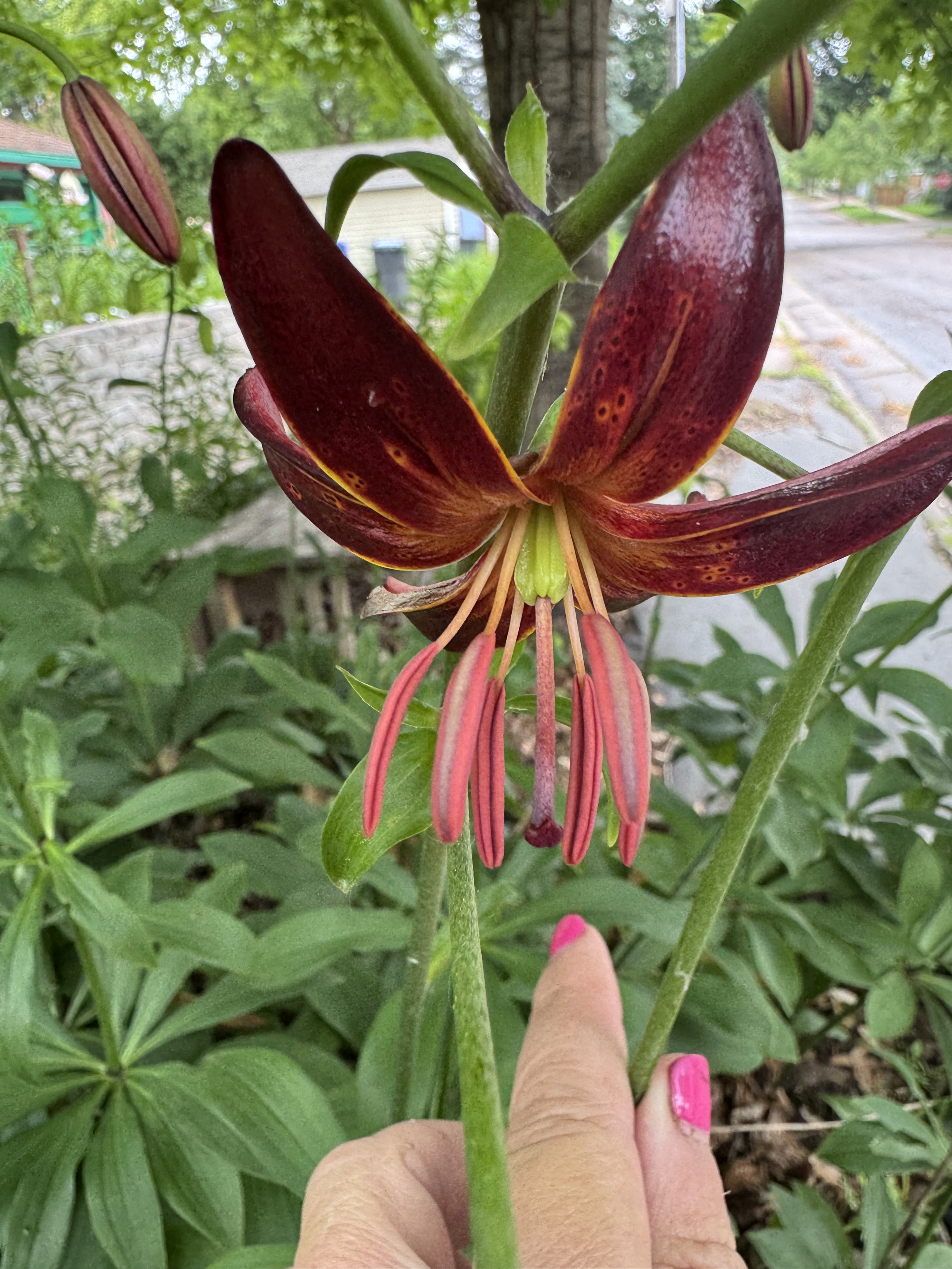 ‘Redman’ R II ( c-d ) pre 1948 Skinner F. L. hansonii x medeolides Bright Red down facing; darker spots; intermediate between parents with color being that of L. medeoloides and form of L. hansonii; June