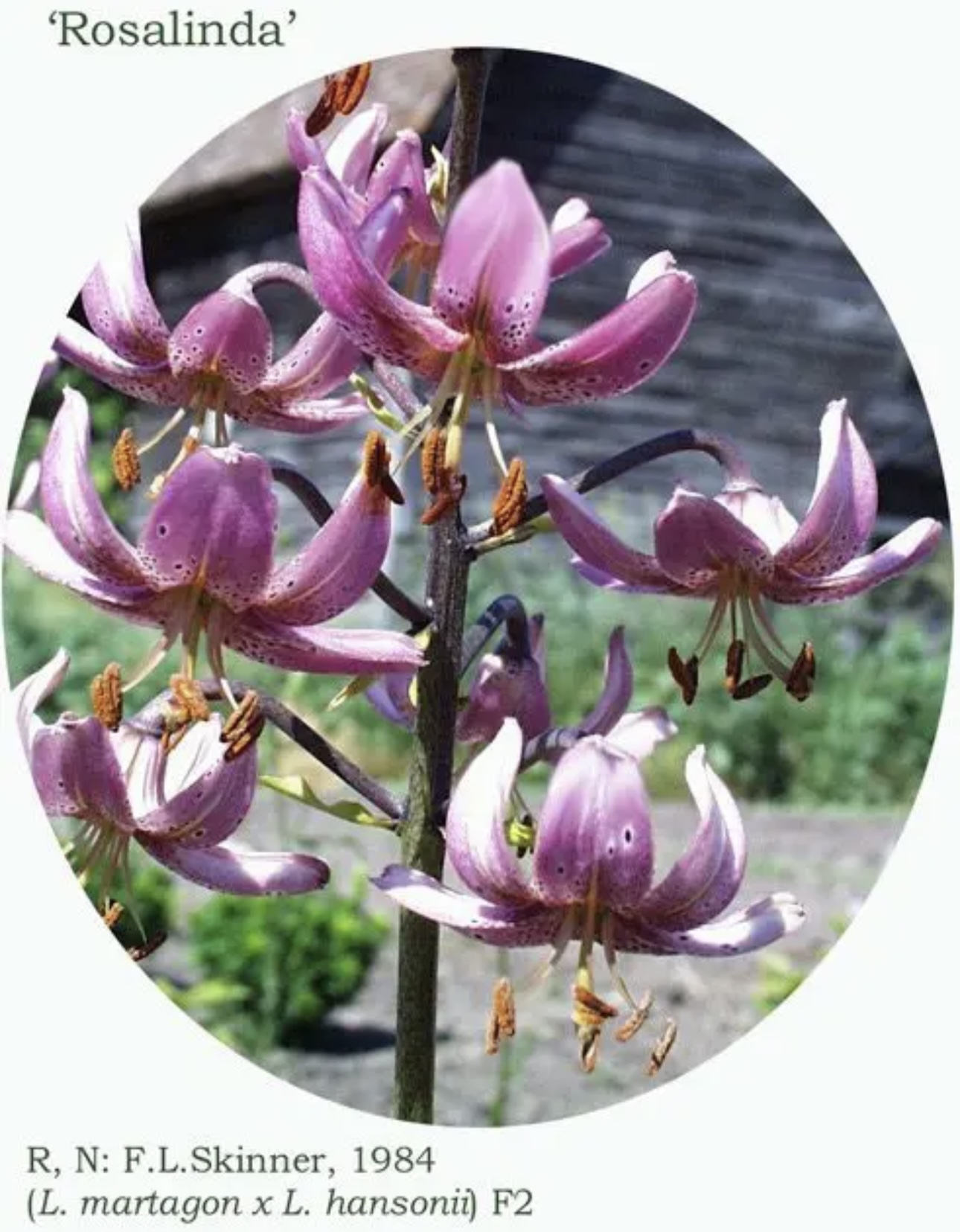 × dalhansonii ‘Rosalinda’ II(c/d) Parentage: (martagon X hansonii) F2 R: F.L. Skinner (pre 1978), N: F.L. Skinner, REG: F.L. Skinner (1983). Fls rose-pink with light red spots. Tepal-margins smooth, tips recurved. Stems with 15-20 fls. July.